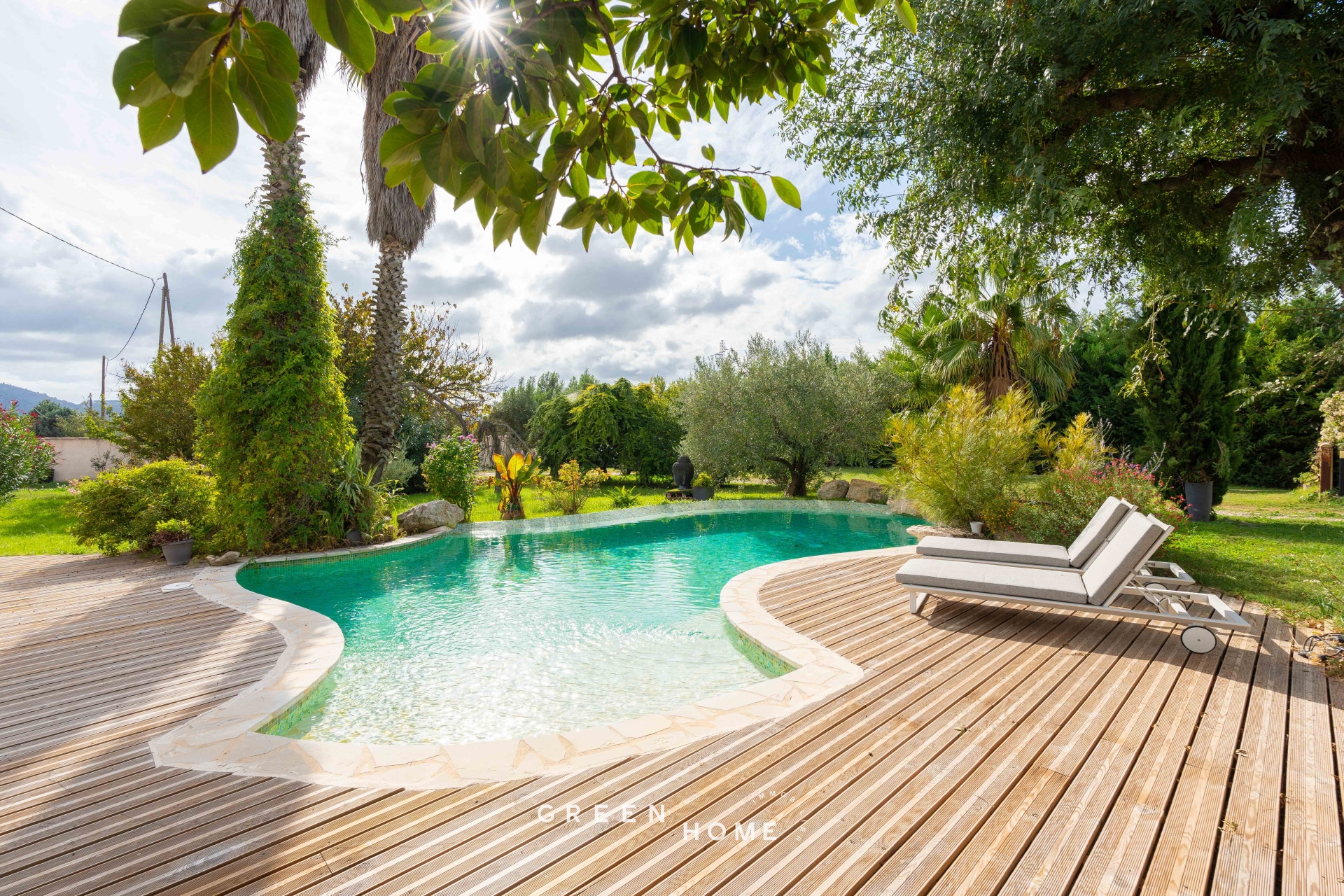 Cadre verdoyant pour cet ancien corps de ferme réhabilité au caractère authentique et singulier. Les pièces principales du bâti s’ouvrent sur le jardin et offrent une luminosité constante. La décoration chaleureuse mêle harmonieusement les matériaux nobles comme les poutres, la pierre, le fer forgé et le marbre. L'entrée dotée d'une cheminée à foyer dessert une vaste cuisine. L’espace nuit se développent sur trois chambres spacieuses dont une suite parentale avec un coin bureau. Le parc arboré composé d'oliviers, plaqueminiers et arbres fruitiers nous transportent dans un écrin au calme. Une dépendance au volume généreux complète la description.