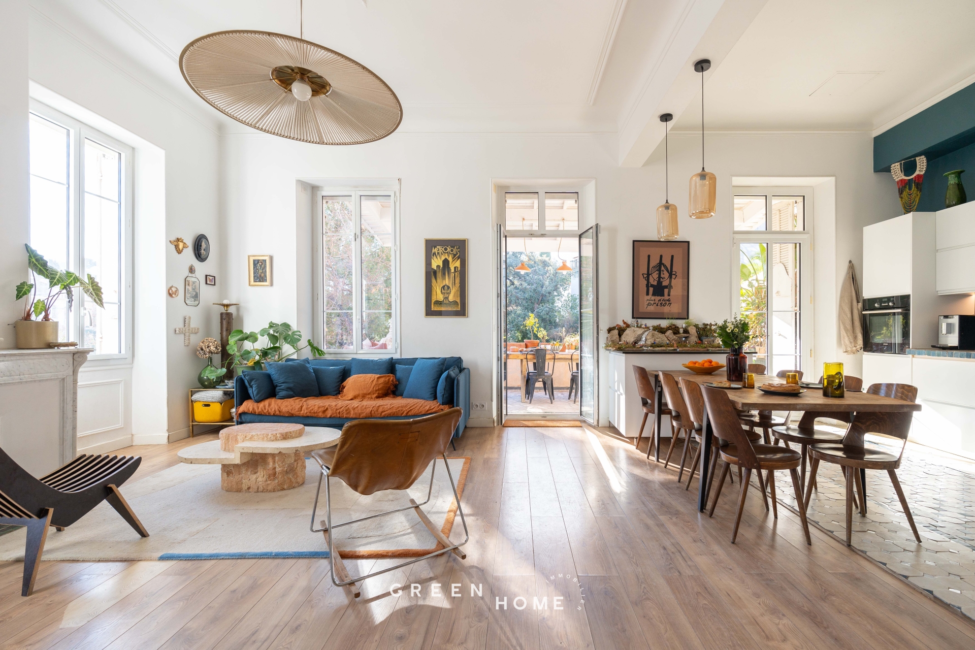 Le chemin du Vallon abrite ce bas de maison de maître au cachet conservé et son jardin paysagé en restanque. La propriété s’ouvre sur un stationnement privatif et par des escaliers, on traverse le décor arboré composé d'un terrain de pétanque, d'une piscine et la terrasse face à la porte cochère de l'entrée. L'intérieur contemporain allie parfaitement modernité et ancien réhabilité. L’espace à vivre baigné de lumière se prolonge vers une terrasse mêlant zellige et terre cuite. Sur ce niveau, une suite parentale avec dressing et salle de bain complète l'environnement. Quelques marches intérieures nous descendent vers trois chambres, coin salon et salle de bain avec buanderie. Le jardin paysagé dissimule à chaque niveau plusieurs espaces de jeu, baignade et repas. Un stationnement fermé en plein air pouvant accueillir un véhicule et moto complète la description.