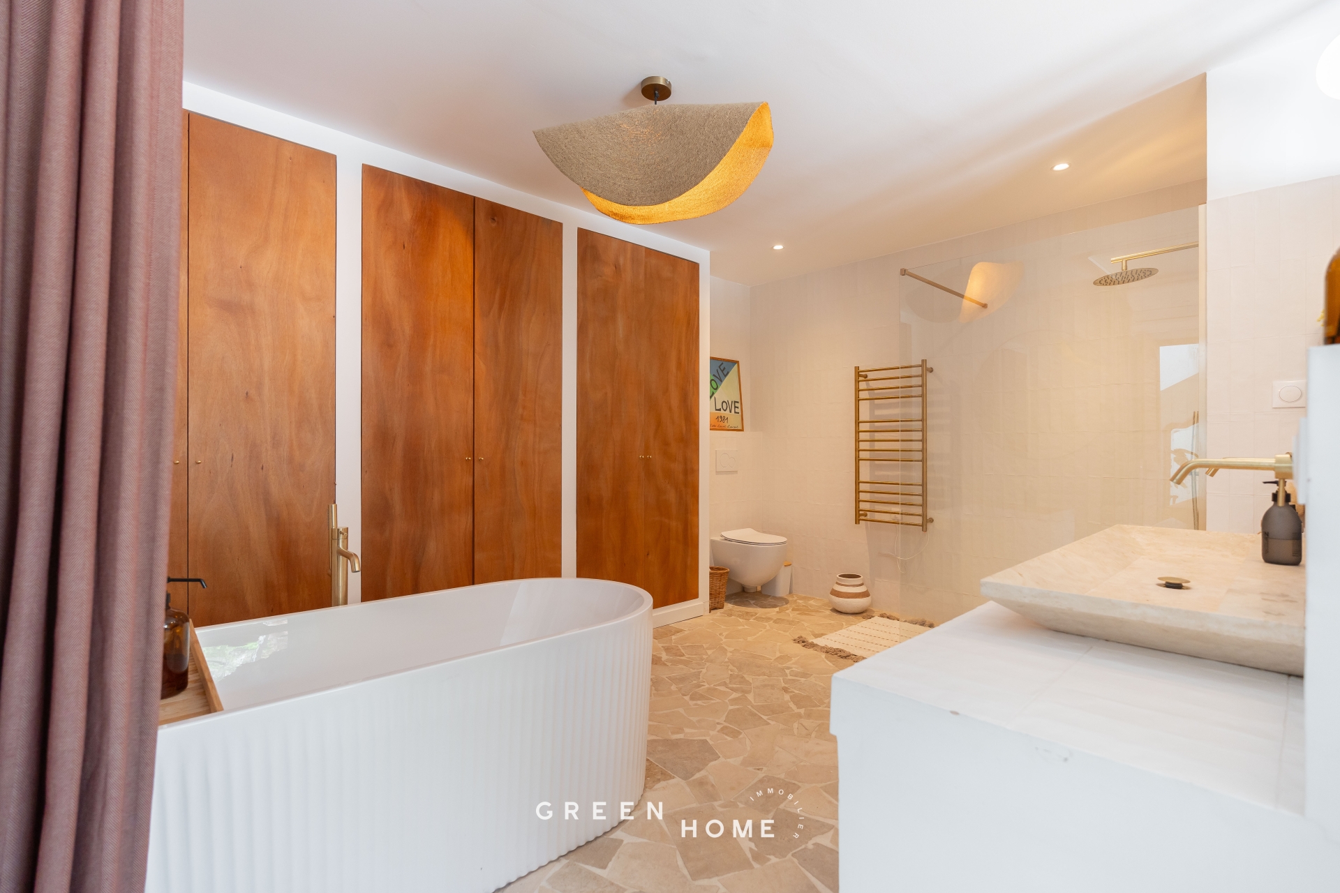 L’ Hacienda est la réunion et la rénovation de deux maisons anciennes pour n’en former qu’une seule en L. La maison s'articule sur deux niveaux largement ouverts sur une magnifique cour pavée d’opus au rez-de-chaussée et sur une véritable oasis à l’étage. Le premier niveau abrite le coin nuit, trois belles chambres en suite, chacune percée par de larges baies donnant sur la cour ombragée par un palmier. Une buanderie, une cave et un studio complètent ce niveau. De larges escaliers mènent à la pièce de vie bordée de larges baies vitrées et surmontée par la cime du toit révélant ainsi la hauteur et donnant à la pièce un air d’atelier baigné de lumière. Le coin repas bordé d’une banquette avec ses coussins est parfait pour se retrouver autour de beaux dîners. La cuisine spacieuse avec ses portes en chêne, sa crédence en terre cuite et son plan de travail en céramique invite à partager des moments de convivialité. À rebours, deux autres chambres en suite ainsi qu’un espace détente parachèvent ce niveau. L'espace salon bordé d’une cheminée est prolongé par une grande terrasse intégrant un coin repas intime. Le jardin abrite une belle piscine bordée d'essences tropicales de strelitzia et de palmiers invite au farniente. Au détour de la hacienda vous tomberez sur un terrain de pétanque et derrière la cuisine sur un espace barbecue. Un parking de quatre places vient compléter cette maison aux allures exotiques...