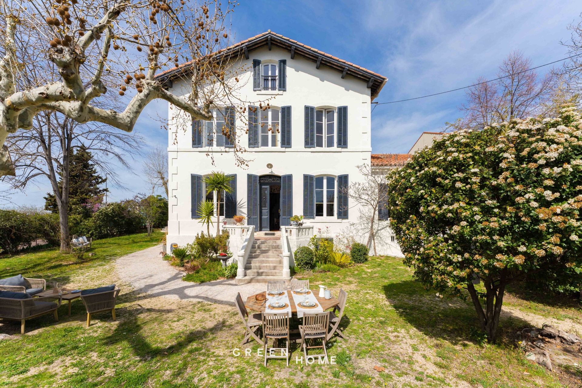 Dissimulée à l'abri des regards dans un jardin privatif du village de Montolivet, cette maison de Maître de style néoclassique est pensée comme un havre de paix invitant à la douceur de vivre. Érigée en 1850, cette propriété familiale est composée d'une bâtisse principale et de sa dépendance. Au détour du jardin et d’une allée, un escalier surplombé de son perron nous incite à entrer. De part et d’autre, le hall principal laisse découvrir une suite de salons au cachet conservé, caractérisés par des tomettes, hauts plafonds, moulures et cheminées en marbre. Dans la continuité, la cuisine et la salle à manger avec son parquet en point de Hongrie et terrazzo ont été entièrement repensées de manière contemporaine et profitent d’une vue directe sur le jardin laissant apparaître au loin la Méditerranée. Baignée de lumière, cette entité traversante compte de nombreuses fenêtres arc surbaissées ouvrant sur la verdure. L'escalier central vertigineux dessert les espaces nuits sur deux niveaux avec une suite parentale, 4 chambres, dressings et salles d’eau. En position dominante, les étages supérieurs s’ouvrent sur un panorama dégagé offrant une vue sur la ville et la Bonne mère. De vastes espaces supplémentaires sont disponibles en R-1 et permettent l’épanouissement d’activités annexes. (sport, musique, bricolage…) La dépendance quant à elle, propose une entrée privative et pourra satisfaire vos besoins supplémentaires en termes d’espace d’habitation, professionnel ou locatif. Un parking pouvant accueillir cinq véhicules complète la description.